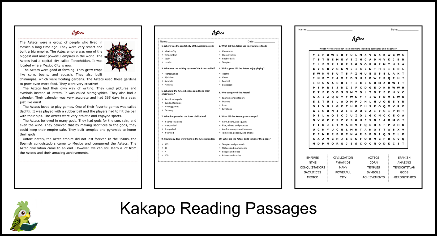 Aztec Reading Comprehension Worksheets
