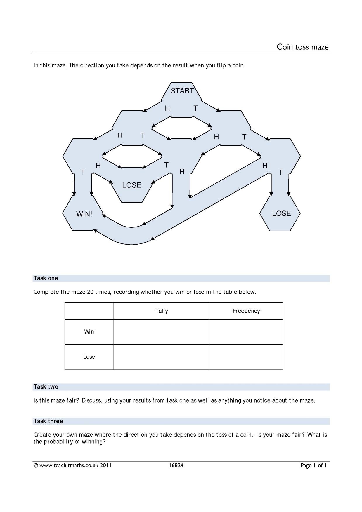 Coin Toss Worksheet KS3 4 Maths Teachit