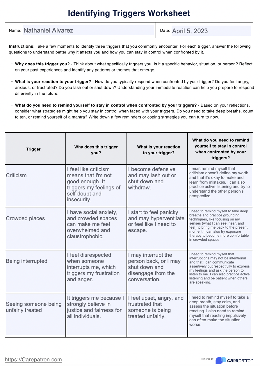 Identifying Triggers Worksheet Editable Fillable Printable PDF