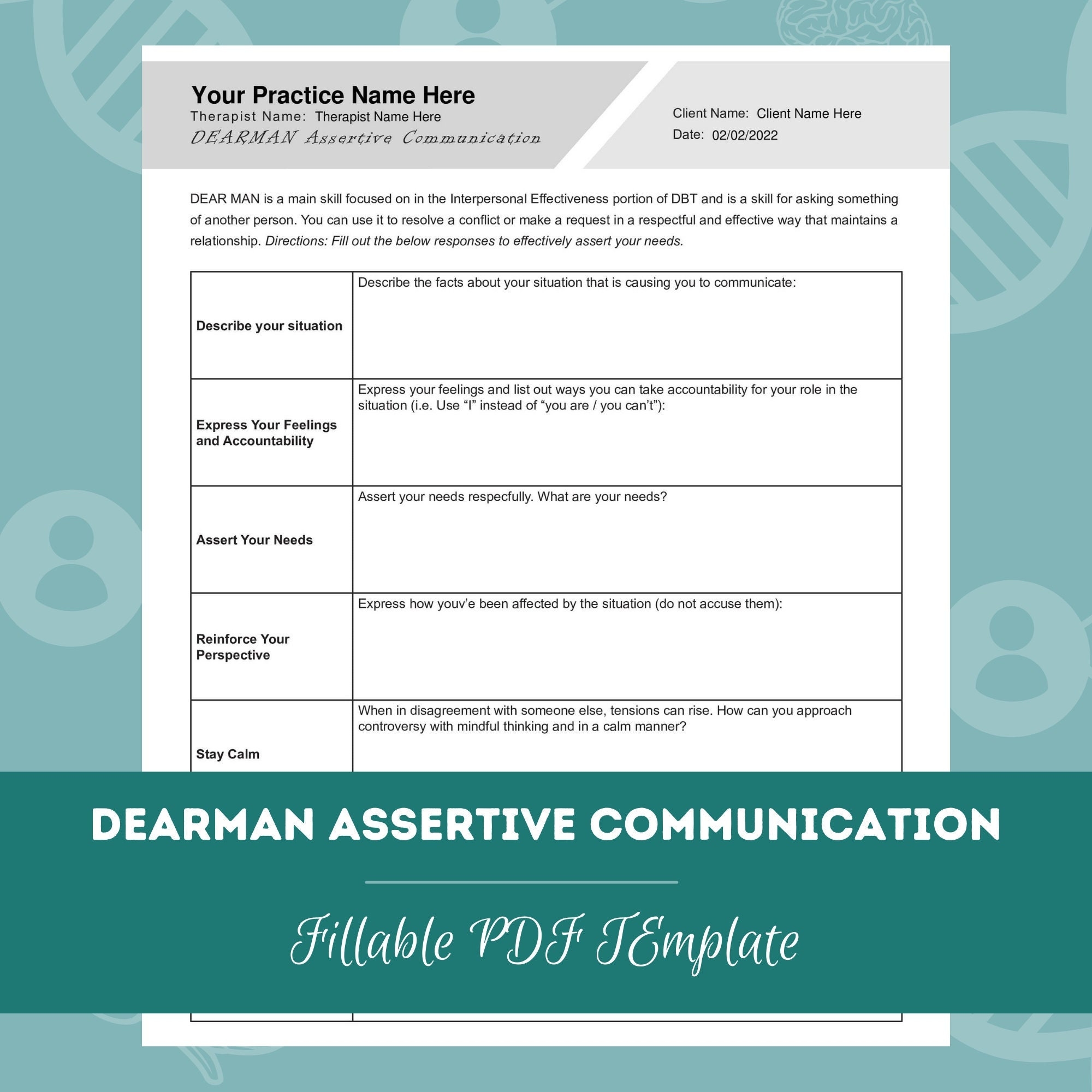 DEARMAN Assertive Communication Worksheet Editable Fillable PDF Template For Counselors Psychologists Social Workers Therapists