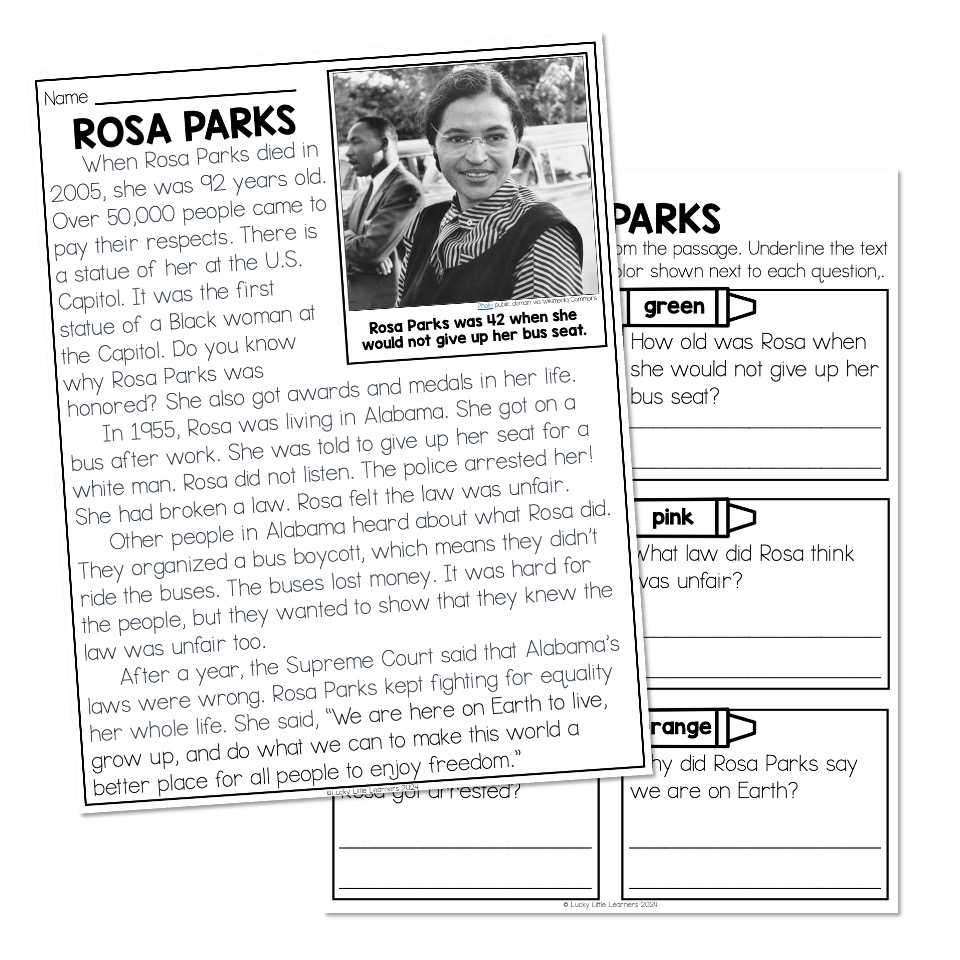 Help your students learn about Rosa Parks in a fun and interactive way with our free reading comprehension worksheets. These resources will inspire students to think critically, engage with history, and reflect on the power of activism and courage. Download your worksheets today and embark on a journey through the life of Rosa Parks!