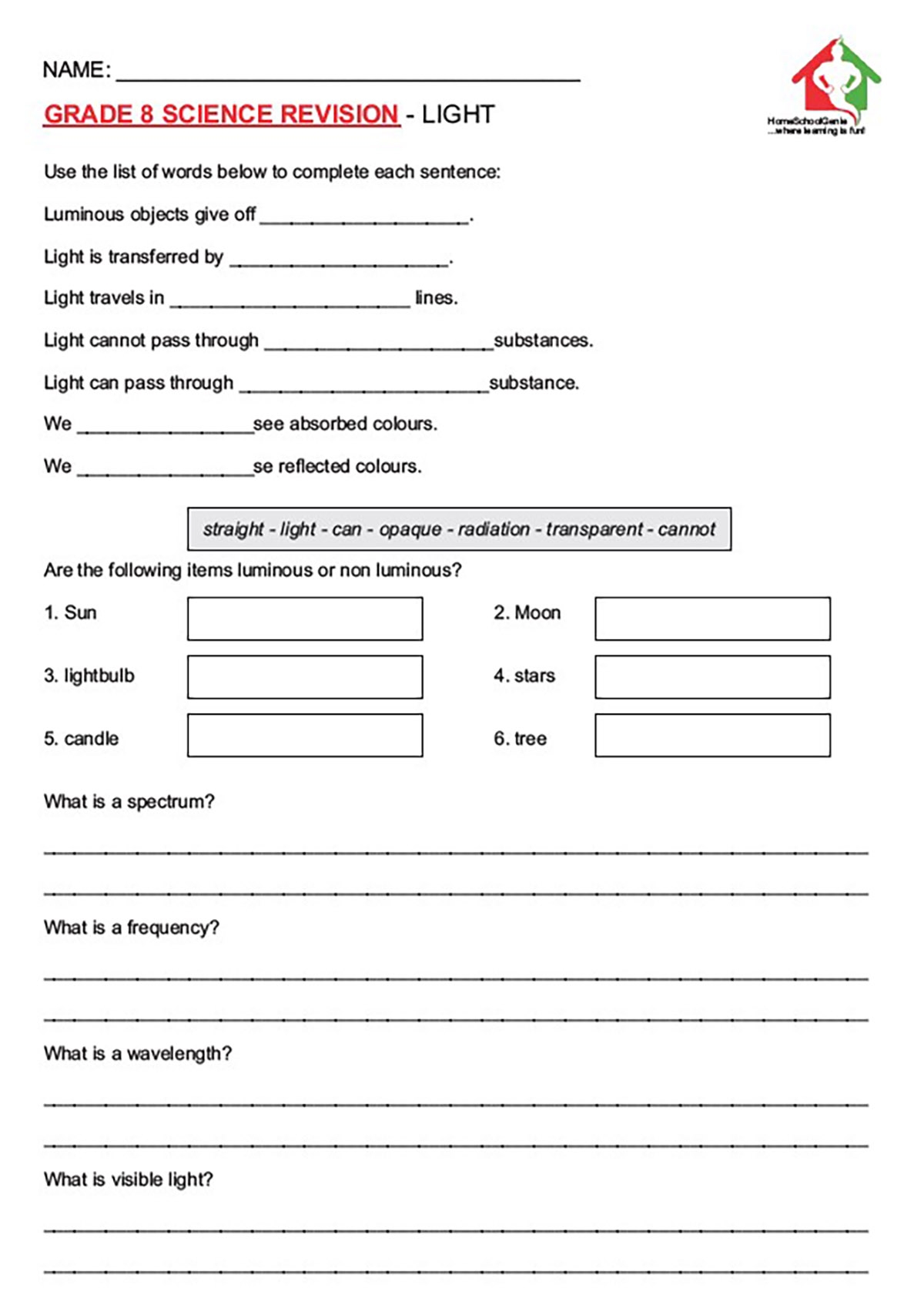 GRADE 8 SCIENCE LIGHT REVISION WORKSHEET