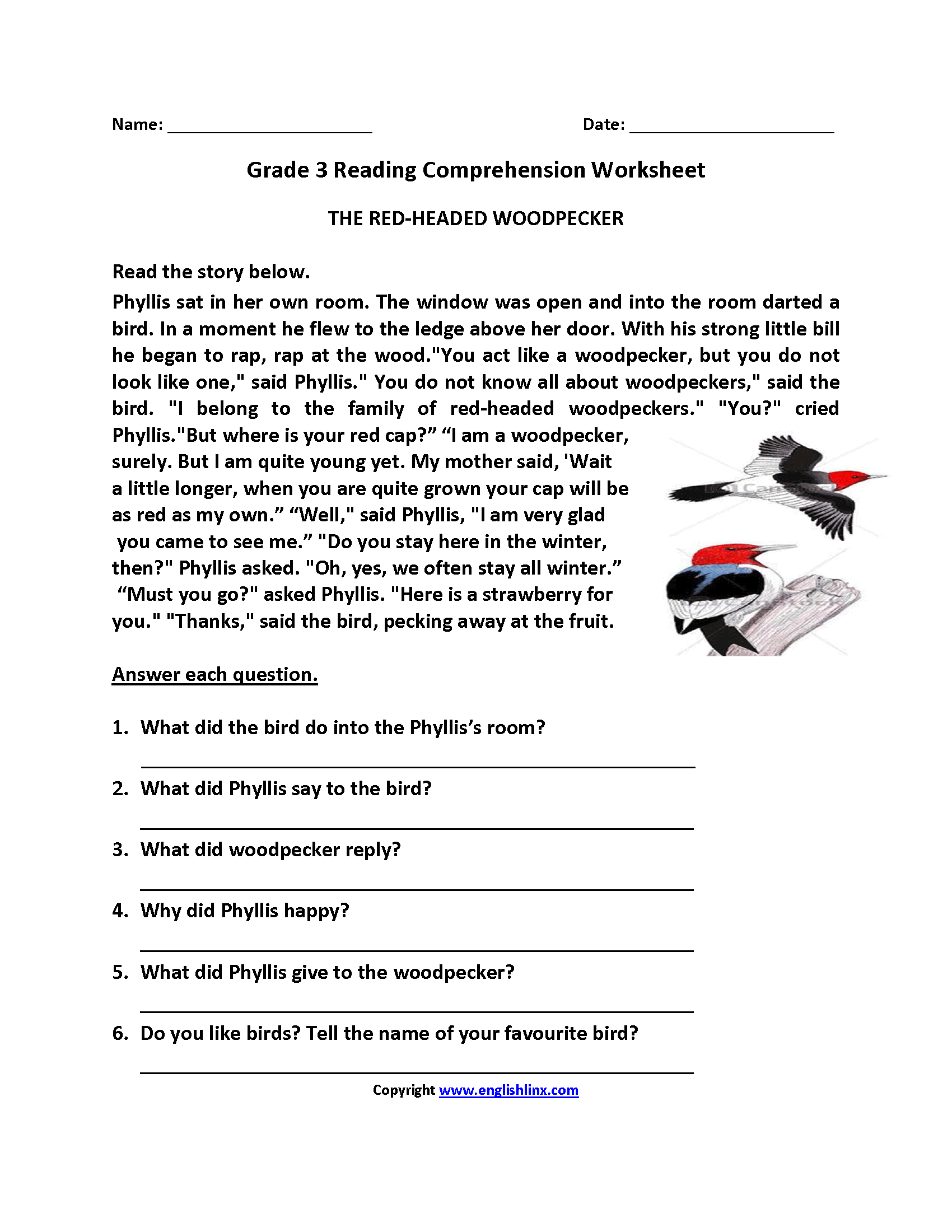 Reading Comprehension Worksheet For Grade 3