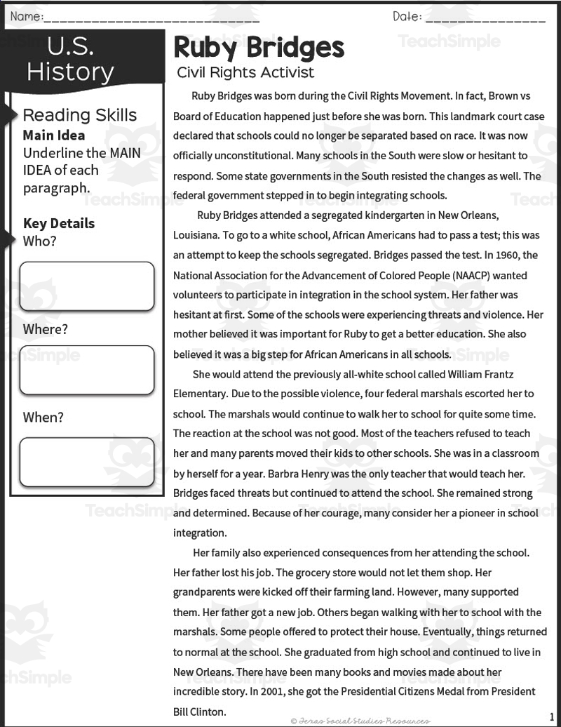 American History Ruby Bridges Reading Packet By Teach Simple