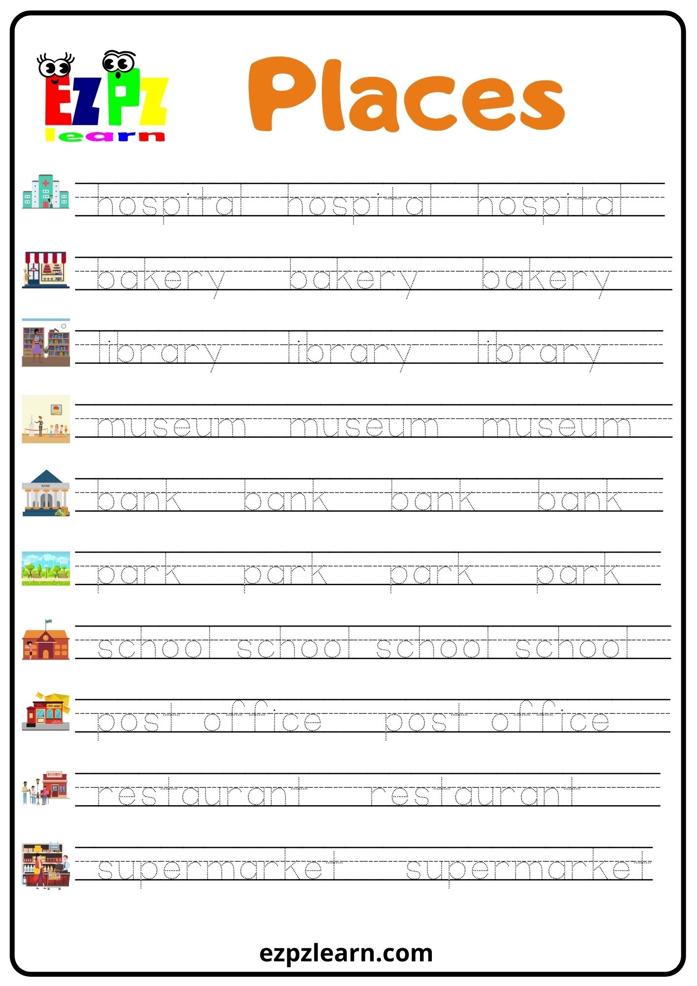 Places 1 Word Tracing Worksheet Ezpzlearn