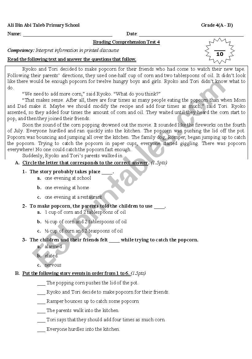 Reading Comprehension For Grade 4 ESL Worksheet By Nanoushka