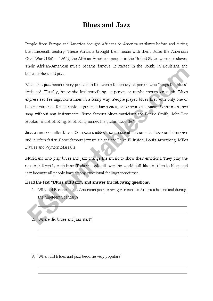 Blues And Jazz reading Comprehension ESL Worksheet By Soksann