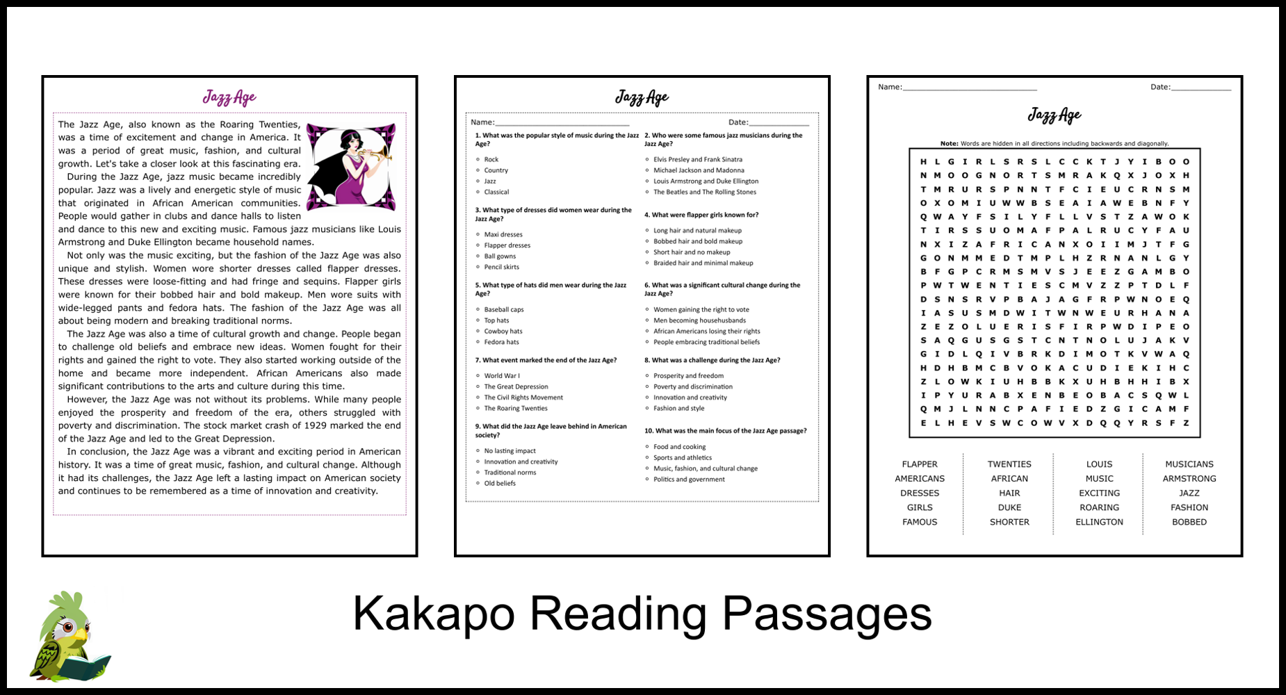Jazz Age Reading Comprehension And Word Search Teaching Resources