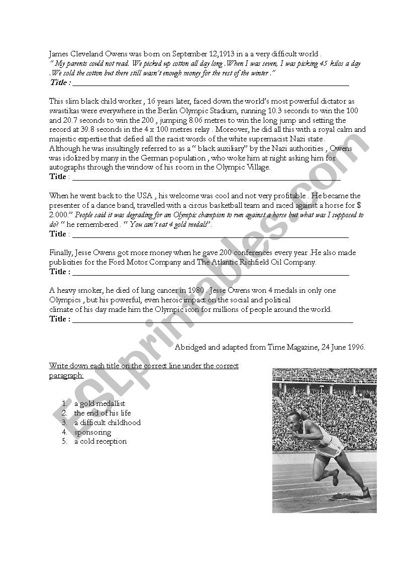 Jesse Owens A Short Biography ESL Worksheet By Raunie