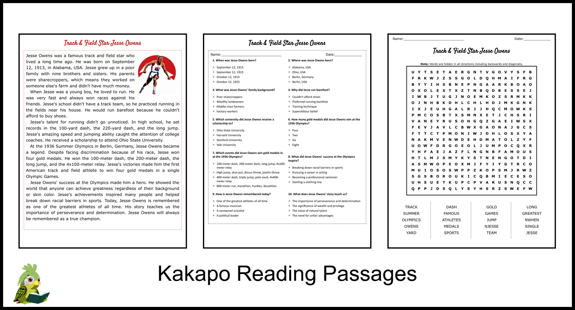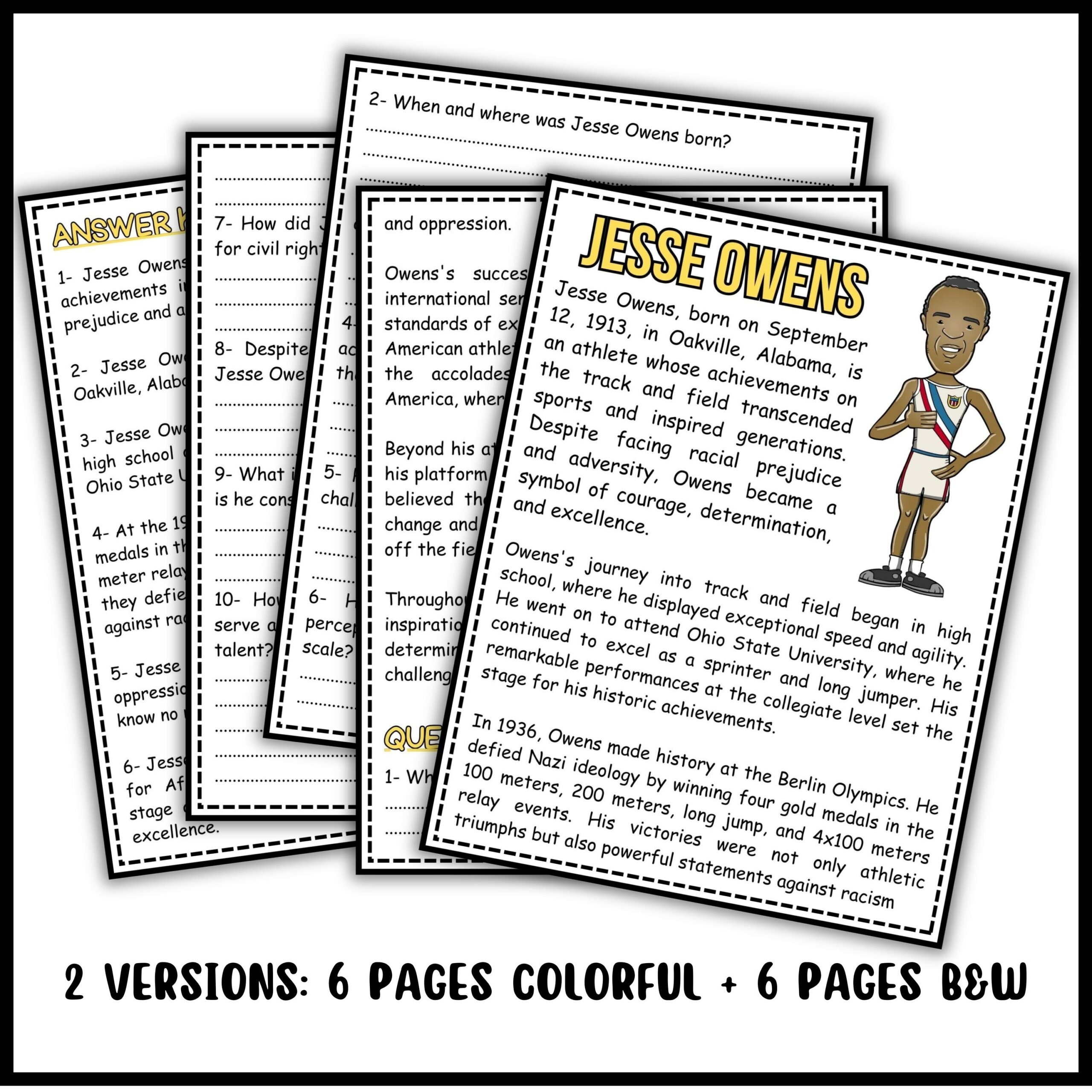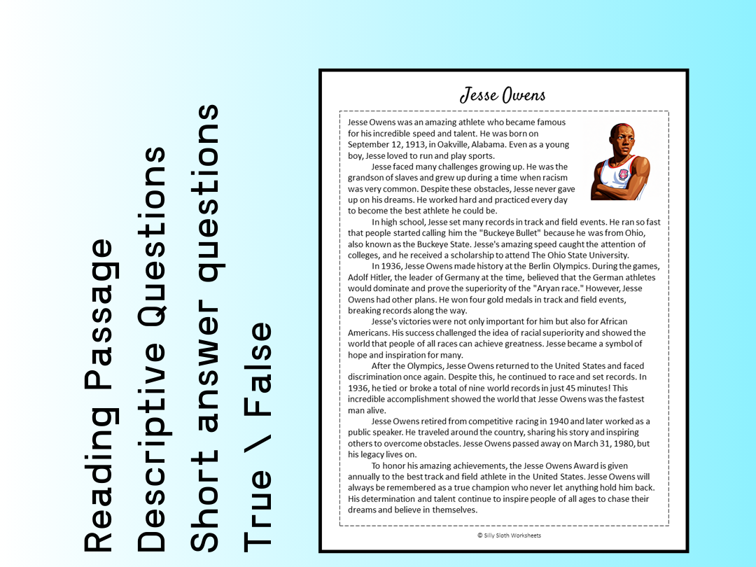 These worksheets are designed to help students improve their reading skills while learning about Jesse Owens’s life, achievements, and impact on sports history. By engaging with these worksheets, students can develop their comprehension, vocabulary, and critical thinking abilities.