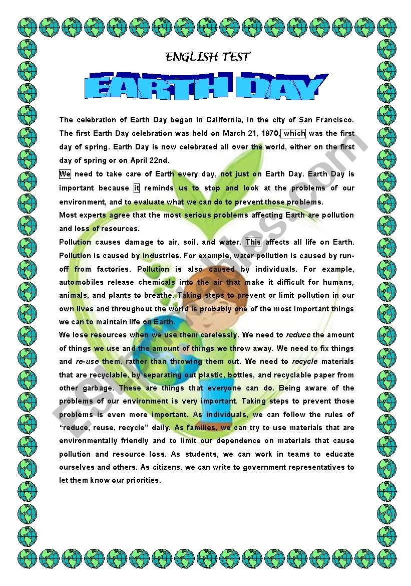EARTH DAY READING COMPREHENSION ESL Worksheet By 1961Anucha