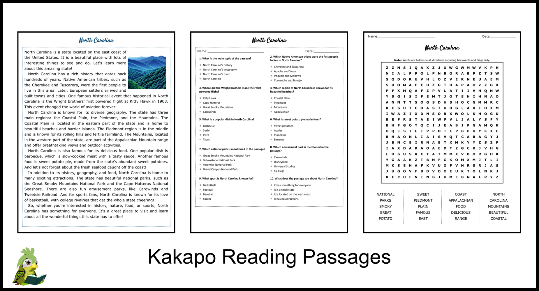 From famous landmarks like the Biltmore Estate to important historical events like the Wright Brothers’ first flight, our worksheets cover a wide range of topics related to North Carolina. Students will enjoy learning about the state while honing their reading skills.