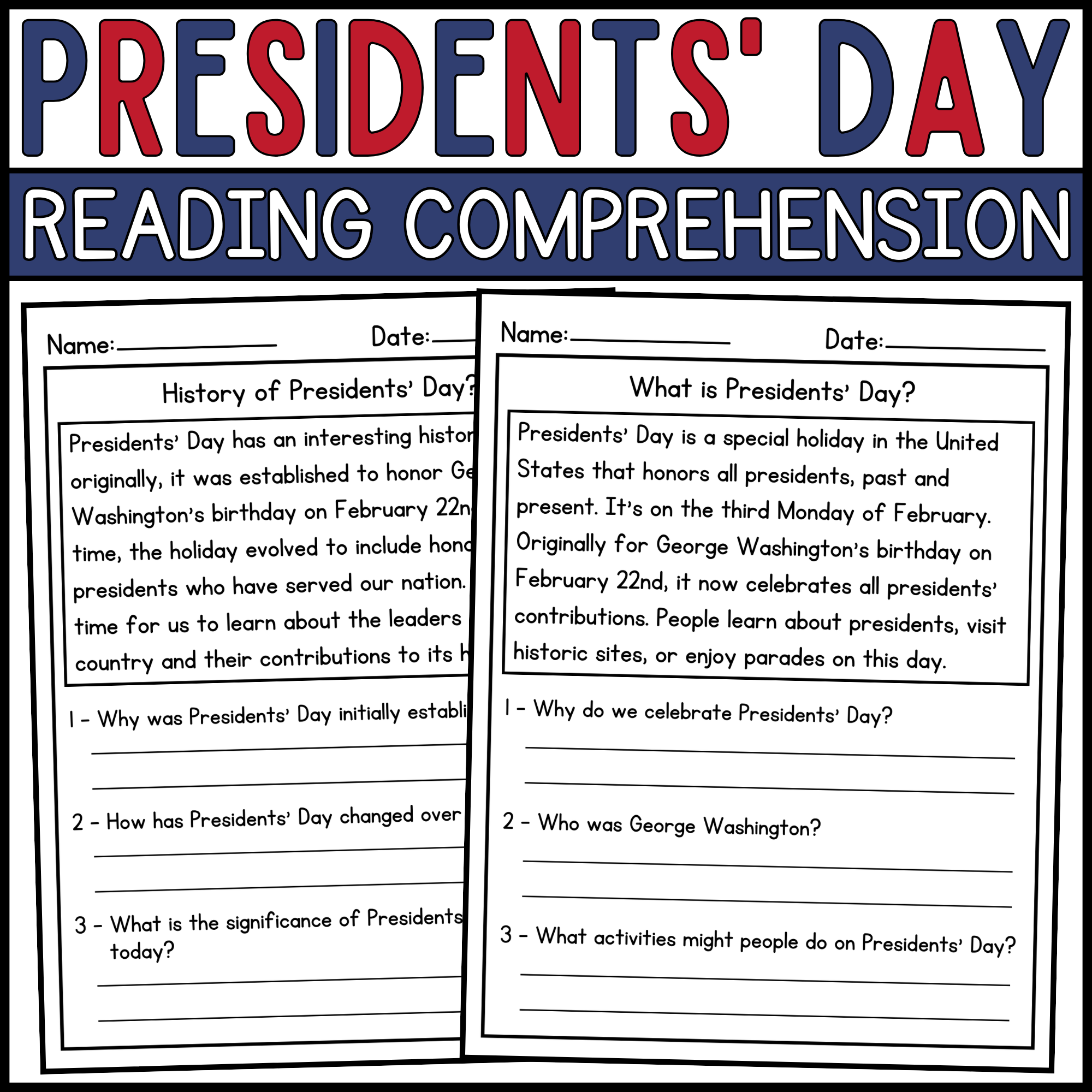 Presidents Day Reading Comprehension Worksheets