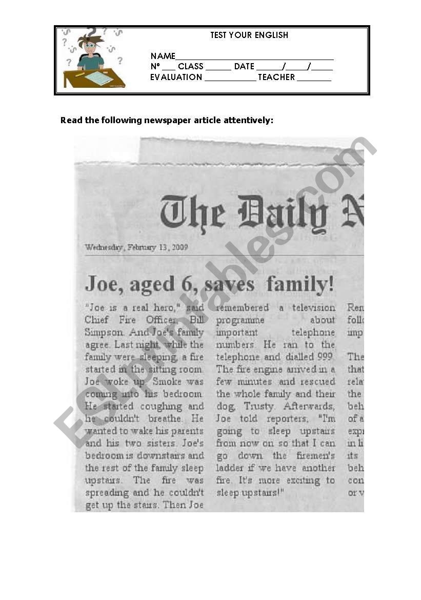 Reading Comprehension Newspaper Article Worksheet