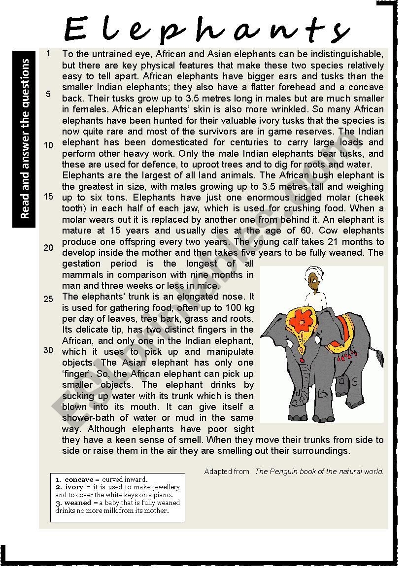 ELEPHANTS Reading Comprehension Varied Questions And Vocabulary