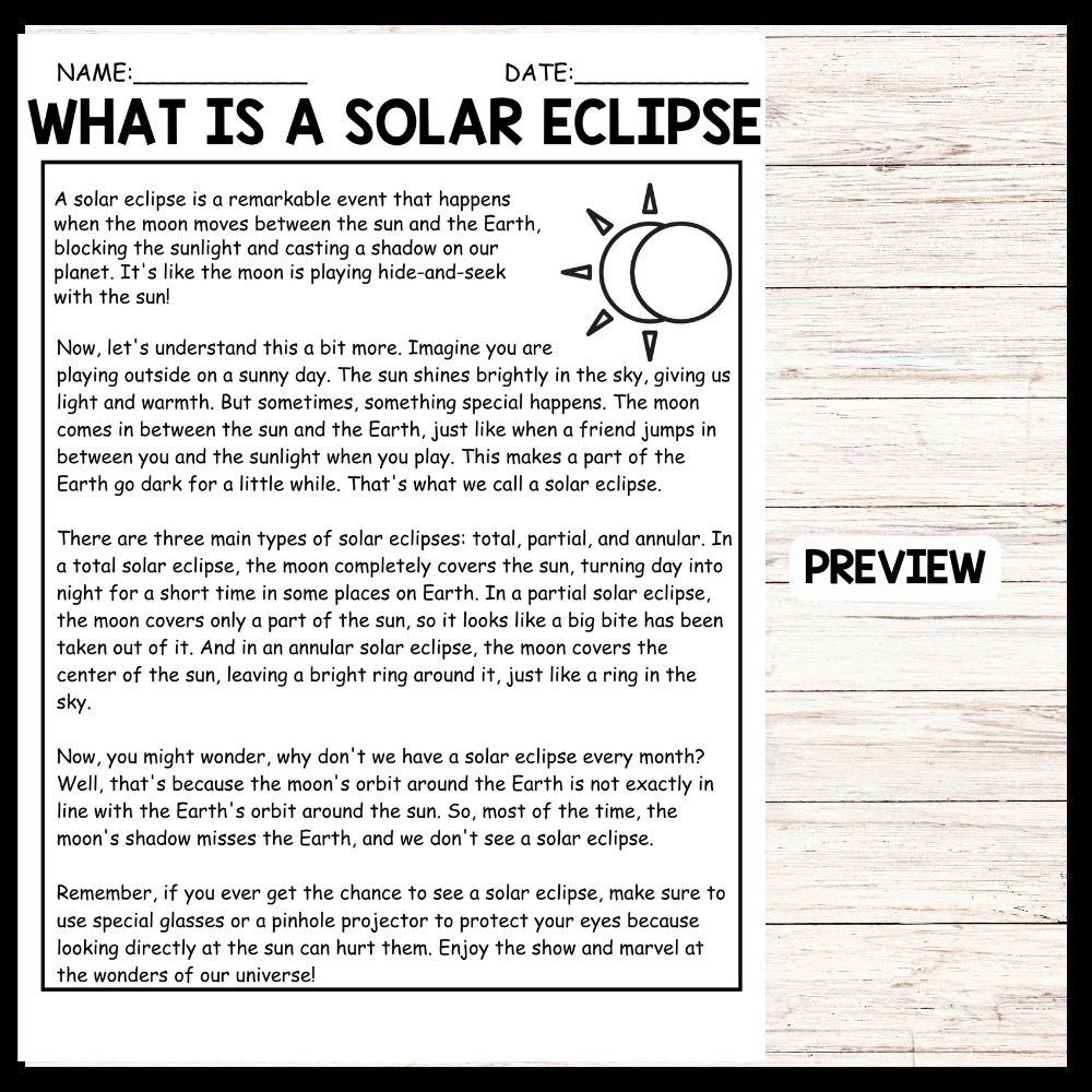 Are you looking for engaging and educational activities for your students about the solar eclipse? Look no further! Reading comprehension worksheets on solar eclipse are a fun way to teach kids about this fascinating astronomical event.