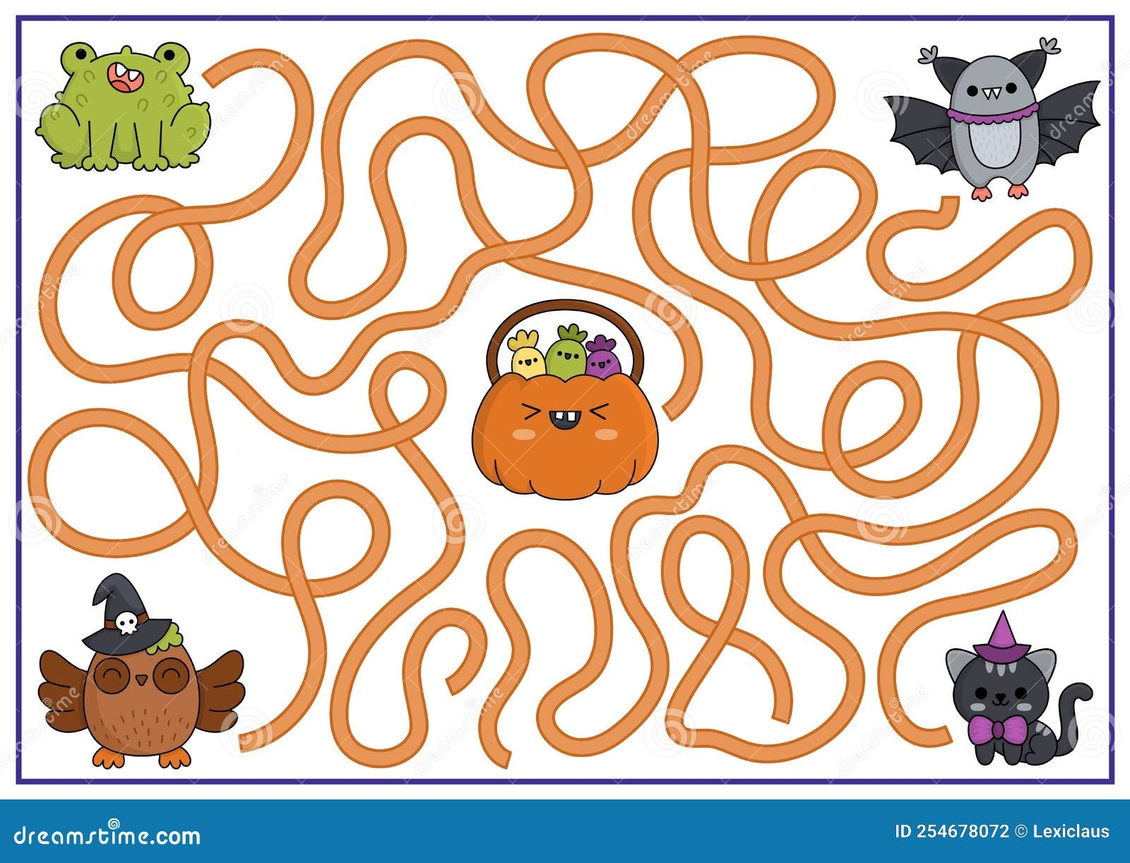 Halloween Maze For Kids Autumn Holiday Preschool Printable Activity With Cute Kawaii Animals And Pumpkin With Sweets Stock Vector Illustration Of Seek Search 254678072