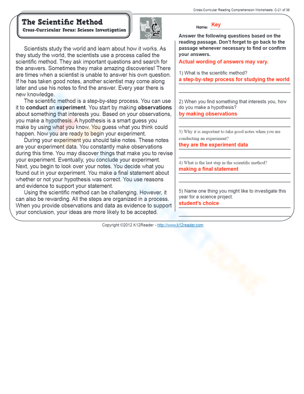 Scientific Method Reading Comprehension Worksheet