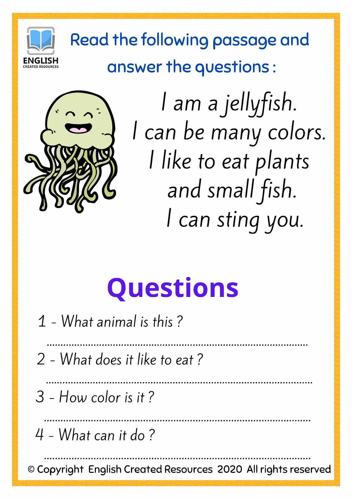 Sea Animals Reading Comprehension English Created Resources