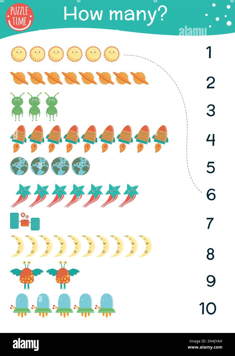 Space Counting Game Math Activity For Preschool Children With Planets Rocket Aliens Stars How Many Objects Printable Worksheet Educational Astro Stock Vector Image U0026 Art Alamy