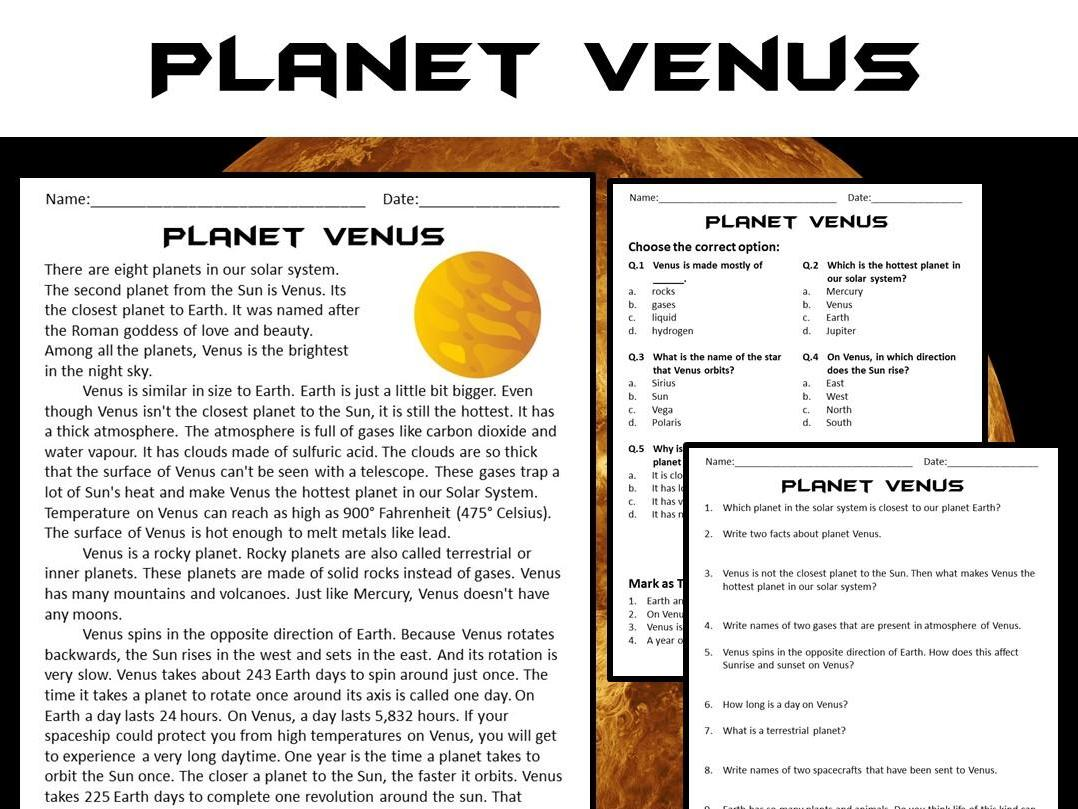 Planet Venus Reading Comprehension Passage Printable Worksheet Teaching Resources
